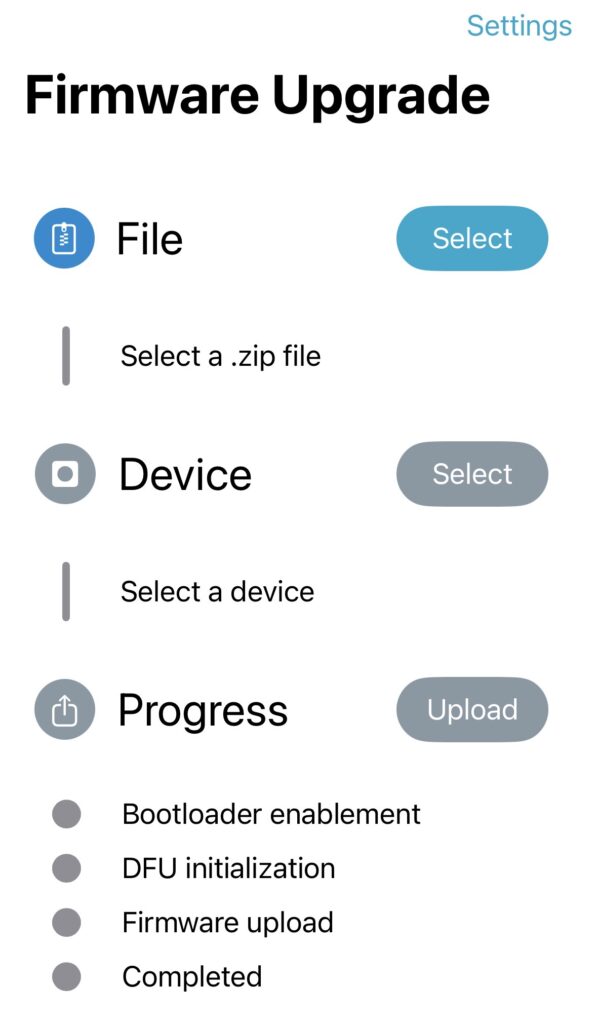 Flip over and run the nRF Device Firmware Application (DFU). You will see the firmware upgrade work flow with three buttons, File, Device, and Progress. Click on the File button and select the firmware you had downloaded before.