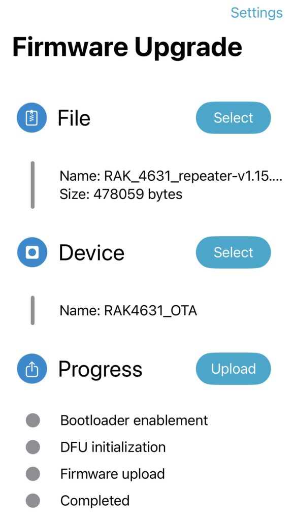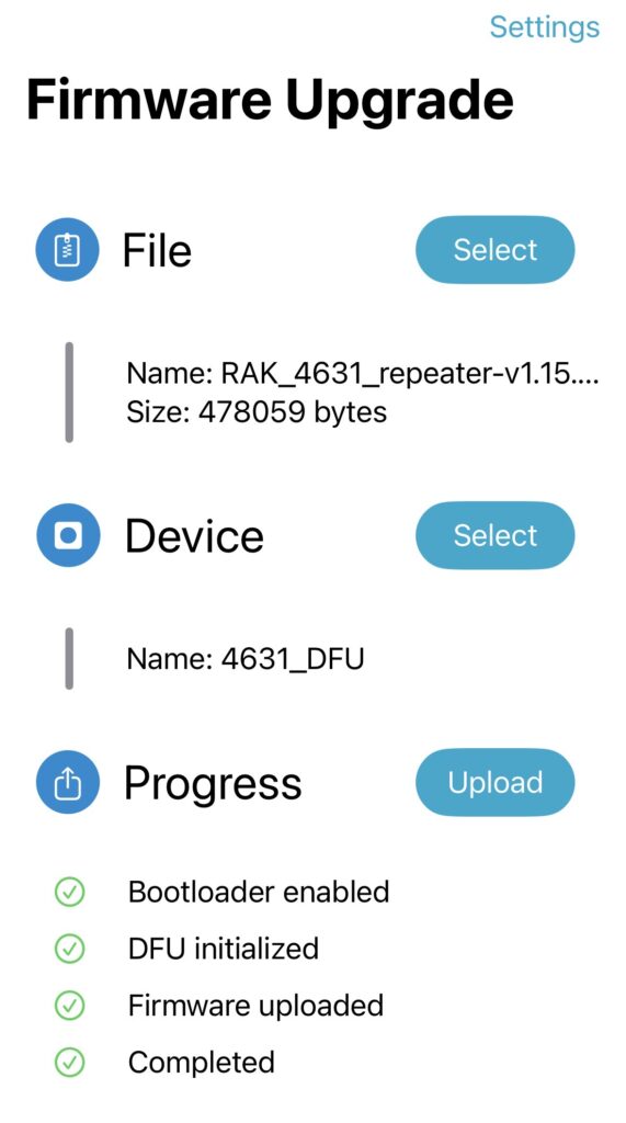 You are now ready to upgrade the repeater over the air. Click on the Progress button. You should see the progress as it enables the Bootloader, Initializes the DFU, and uploads the firmware.