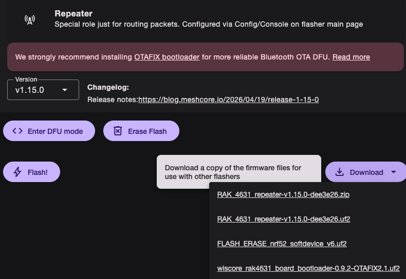 Go to either the MeshCore Web Flasher or the GitHub MeshCore releases repository. Find your device and select the firmware for either the Repeater or Room Server (in this case we are upgrading our repeater so we will select the Repeater Firmware). If you are using the Web Flasher, you will find the files under the download button. Click on the file that ends in zip. That is the one you want to download.